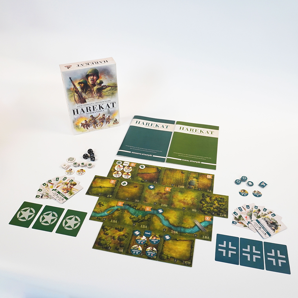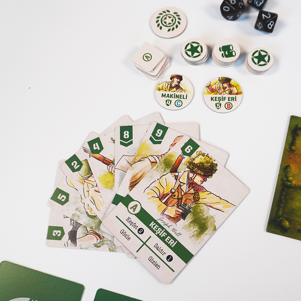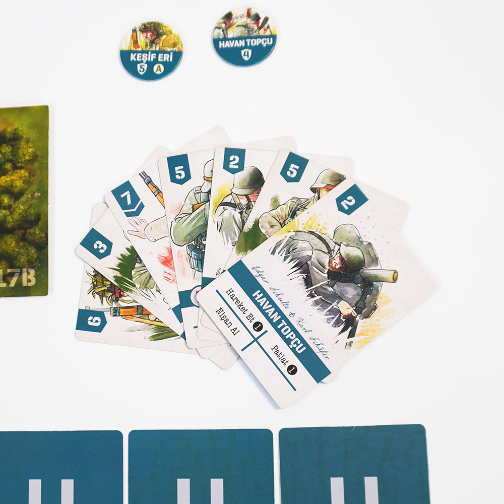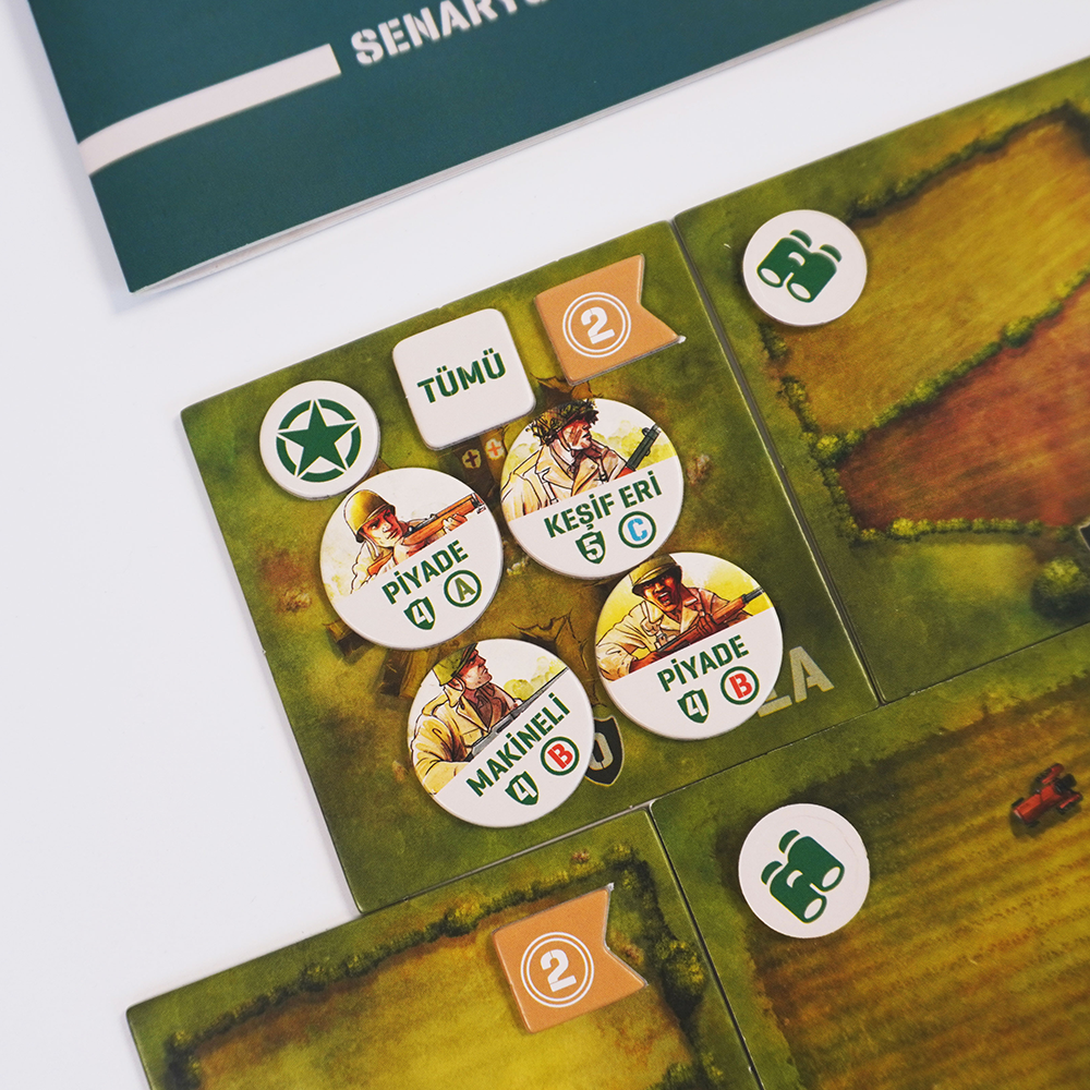Oyun grubuma daha önce çok kötü bir oyun oynatmıştım talihsizce, haliyle bu oyuna da çok önyargılıydılar. Ancak oyun sonunda herkes oyundan çok keyif aldı. Tavsiye ederim. Baskı olarak kutunun bir köşesi çarpılmış geldi ama olsun sorun değil :)Oyunun 2 kişilik oynandığına bakmayın, 4 kişiyle de çok keyifli oluyor ve 2şerli takımlar halinde oynanıyor. Kurallar şöyle1- Oyun kurulumunda A ve B mangalarının olduğu senaryoları oynayın. Biz C mangasını oynamadık kafa karıştırmasın diye ilk oyundan.2- Alman takımından bir oyuncuya astsubayı, A manga liderini, Piyade erini, keşif erini ve savaş sisini verin diğer oyuncuya da takım rehberini, B manga liderini, Piyade erini, Keşif erini ve savaş sisini verin. Amerika takımına da aynısını yapın.3- Nişancıları ve Havan Topçularını her iki oyuncu da destesine katabilir olsun. İkisi de yönlendirebilir aynı birimi. Ancak A ve B mangalarını manga lideri olan oyuncu yönlendirebilir ve o manganın kartlarını alabilir.4- Oyun başlangıcında desteden herkes 3 kart çeker ve 1 kartı inisiyatif olarak kullanır. Takımlar birbirine göstermeden kullanacakları kartları belirleyebilir. Belirlendikten sonra tüm oyuncular kartlarını açar ve takım toplamında kim öndeyse o takım ilk başlar.5- Her oyuncu inisiyatif kartını kullandıktan sonra tur boyunca 2 kart oynar ve sıra takım arkadaşına geçer.6- Takım içindeki sırayı takım oyuncuları belirler. Stratejiye bağlıdır.7- Takım oyuncuları kartlarını birbirlerine gösteremezler. (Opsiyonel. Yeni başlıyorsanız yardımlaşma amacıyla gösterseniz de sorun olmaz, sonuçta takım oyunu.)8- Herhangi bir noktada kural eksikliği yaşarsanız, herkesin hemfikir olacağı şekilde o kuralı oluşturun.Biz bu şekilde oynadık ilk oyunu ve herkes memnun kaldı. Dilerseniz siz de deneyebilirsiniz.